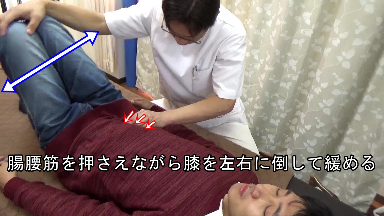インナーマッスル大腰筋腸腰筋を押さえながら膝を左右に倒して緩める