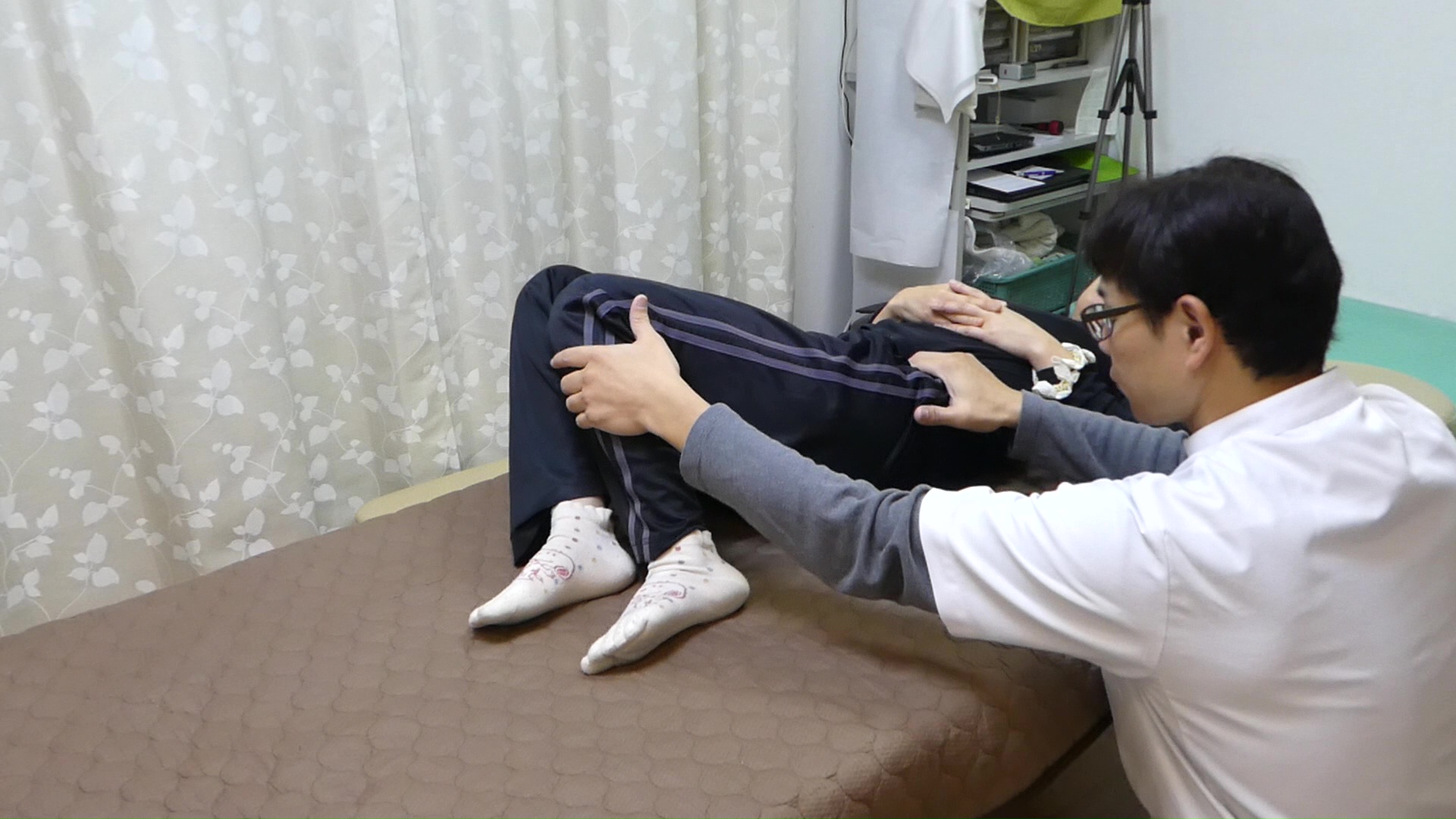 インナーマッスル大腰筋腸腰筋を押さえながら膝倒し運動