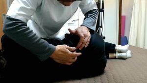 肋骨から骨盤にかけての筋肉の表層の皮膚を固定して前後を伸ばす触圧覚刺激法